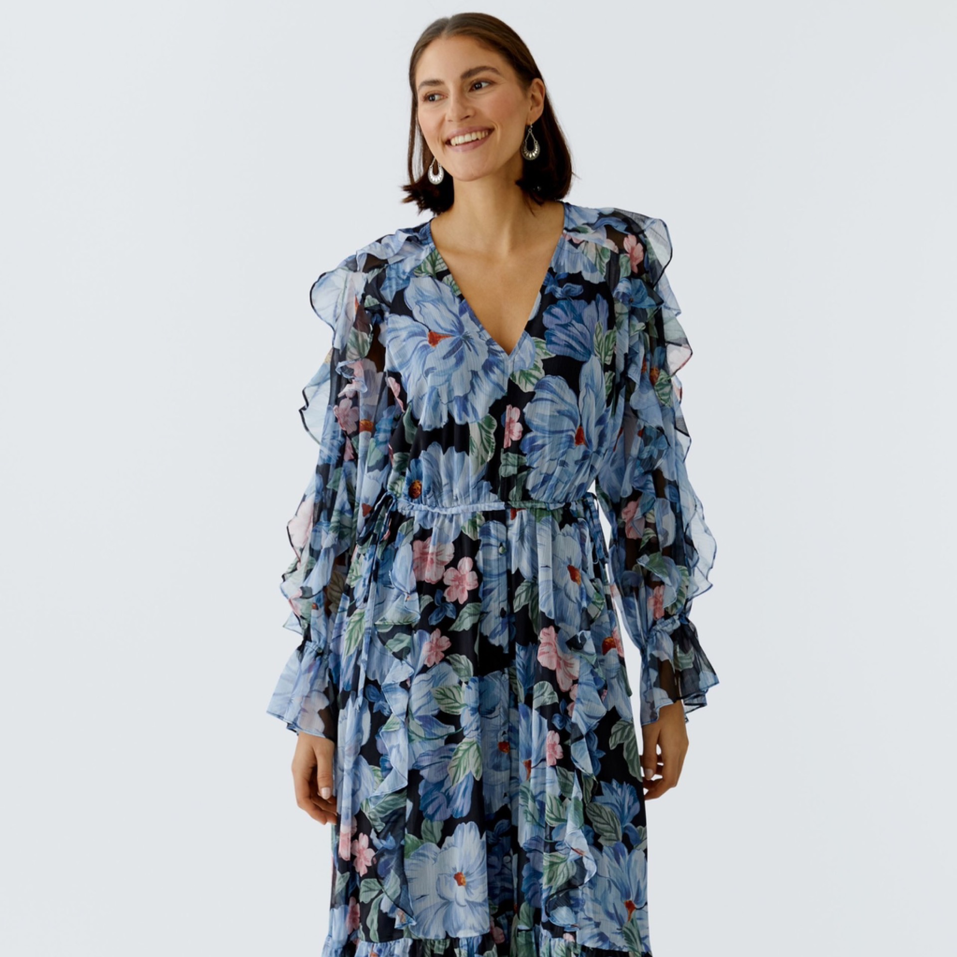 The Oui Navy Blue Floral Chiffon Effect Dress combines elegance with comfort, featuring a delicate floral design on lightweight chiffon-effect fabric. The button-through style adds a classic touch, while the long sleeves provide versatility for various seasons. Crafted with attention to detail, this dress offers a flowing silhouette for ease of movement. Perfect for both casual outings and formal occasions, it ensures a polished and feminine look. 100% polyester, lining 100% viscose