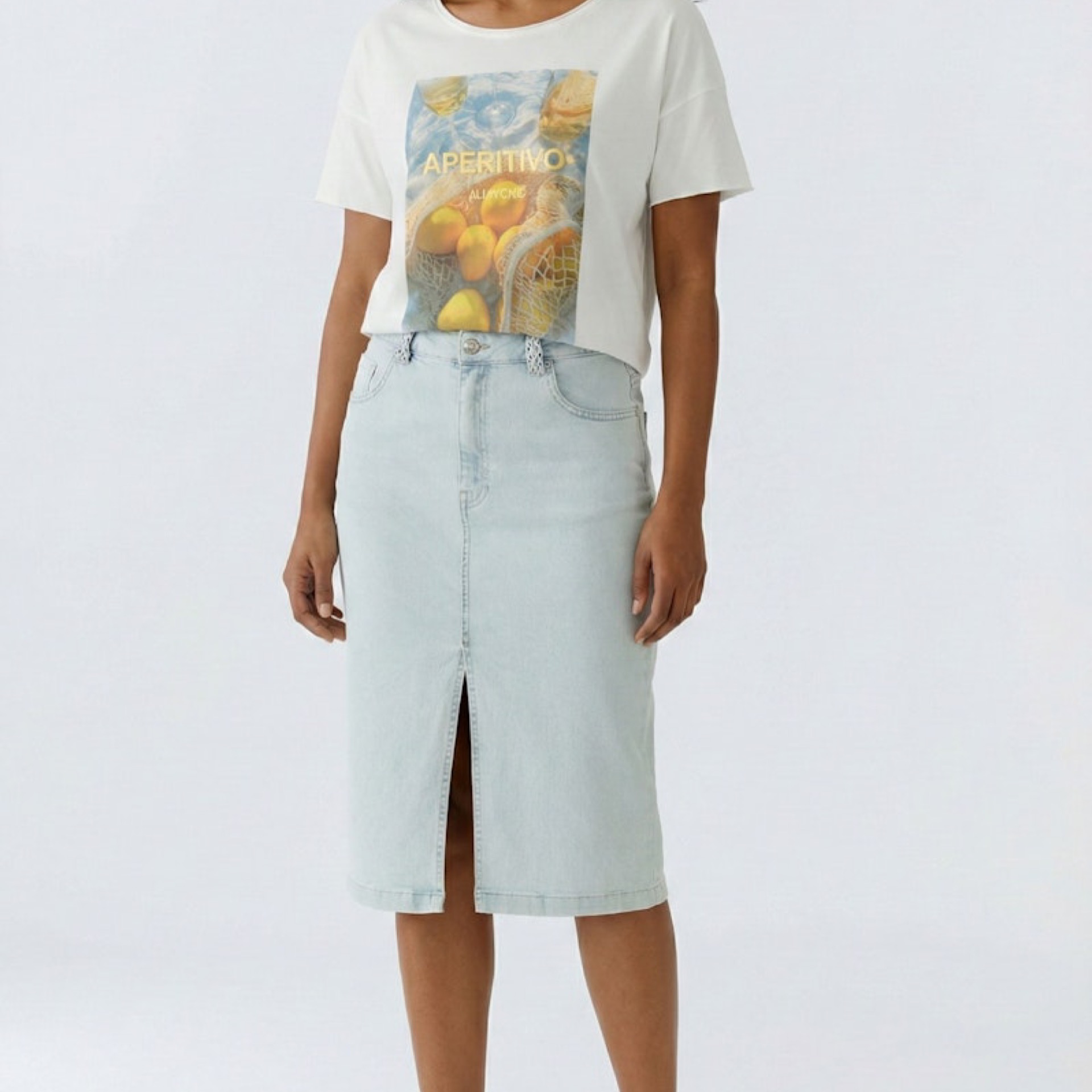 The OUI Optic White Denim Effect Skirt combines a modern design with versatile styling options, making it a practical addition to any wardrobe. Crafted from lightweight fabric, it offers the look of denim while ensuring a comfortable fit for all-day wear. The optic white shade adds a fresh and contemporary touch that pairs effortlessly with various tops and accessories. Whether styled for casual outings or dressed up for more formal occasions, this skirt delivers both style and functionality with ease.