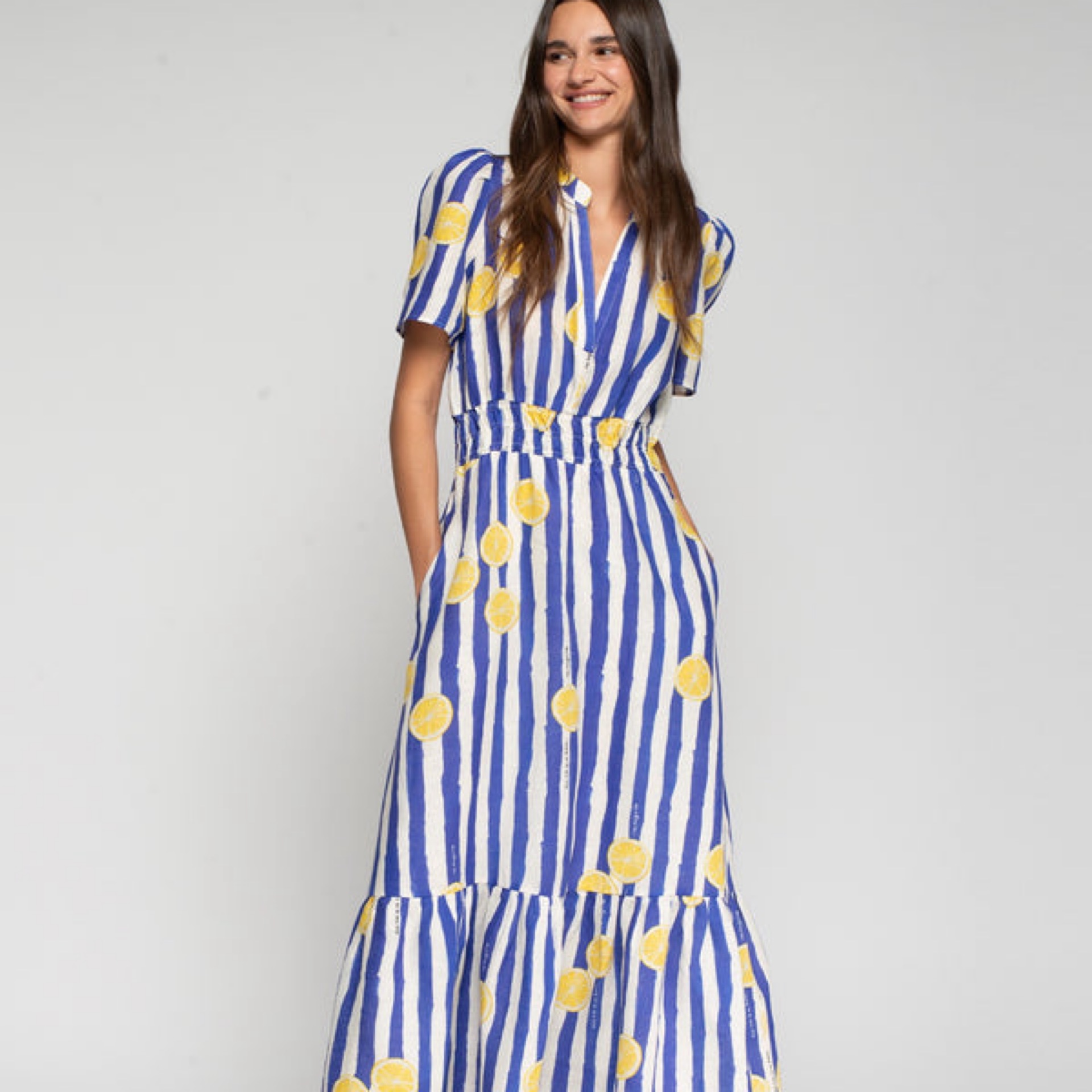 The Vilagallo Lemon Print Stripe Linen Dress showcases a refreshing lemon print paired with an elegant striped design, perfect for warm-weather styling. Crafted from breathable linen fabric, this dress ensures comfort and ease throughout the day. Its lightweight construction and vibrant pattern make it a versatile choice for casual and semi-formal occasions.